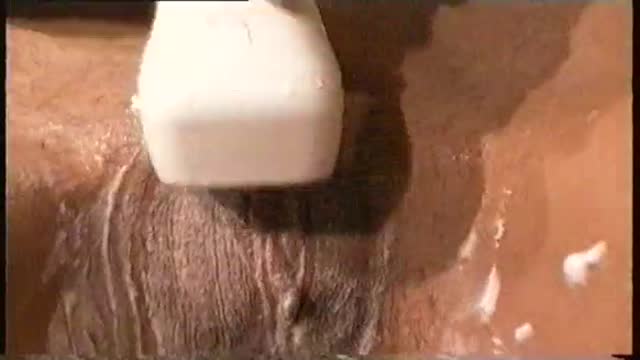 A busty brunette in a tight black vinyl outfit and stockings makes a huge mess. She lathers herself up with shaving cream and uses a razor for some personal grooming before a man steps in to take over.
