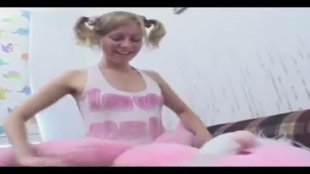 A playful blonde teen with cute pigtails starts off teasing with her stuffed bunny before a guy joins her on the couch. Things heat up quickly as she strips him down and gives him an impressively deep blowjob.